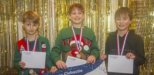 Tijdens het jeugdkerstdiner op vrijdag 12 december werden de drie jongeren die de meeste loten verkochten, in het zonnetje gezet en zij kregen dan ook een cadeaubon. Op de tweede/derde plaats stonden Naud (links op de foto met de drie jongens) en Jelle (rechts) met elk 78 verkochte loten. Liam in het midden houdt hier met trots de eindscore vast! Alle kinderen die meer dan 25 loten wisten te slijten, kregen op 12 december een mooie medaille. Op de groepsfoto staan enkelen van hen: naast de genoemde topdrie zijn dat Sem, Sem en Felipa (staand) en Jette en Anna (zittend).
